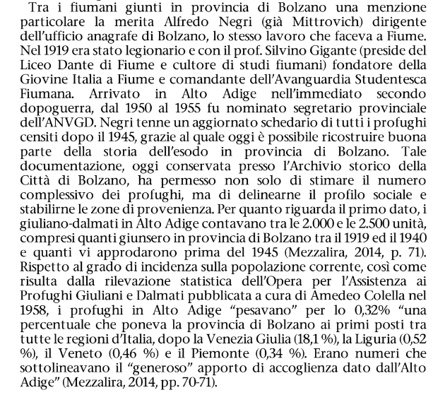 Era questa dell’armadio, però, l’anagrafe che più amava Alfredo Negri: quella dei profughi scappati dall’Istria, da Fiume e dalla Dalmazia tra il 1945 ed il 1947 e poi rifugiatisi qui, a Bolzano a cercare un'altra vita ...