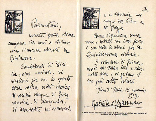 Una delle lettere con le quali il D'Annunzio esortò i siciliani ad arruolarsi.