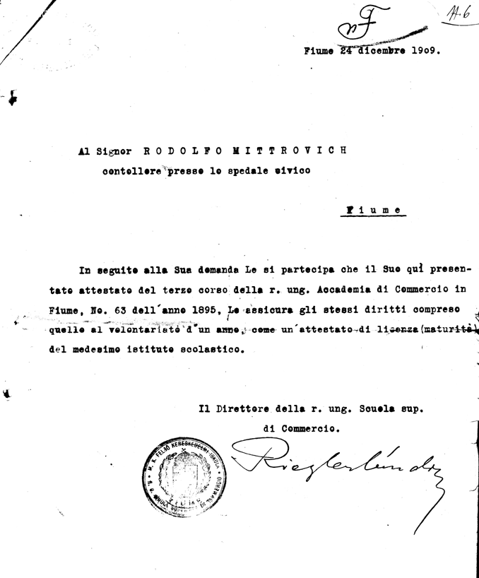 della r. ung. Scuola di Commercio in Fiume. In alto a sinistra un timbro a secco, non