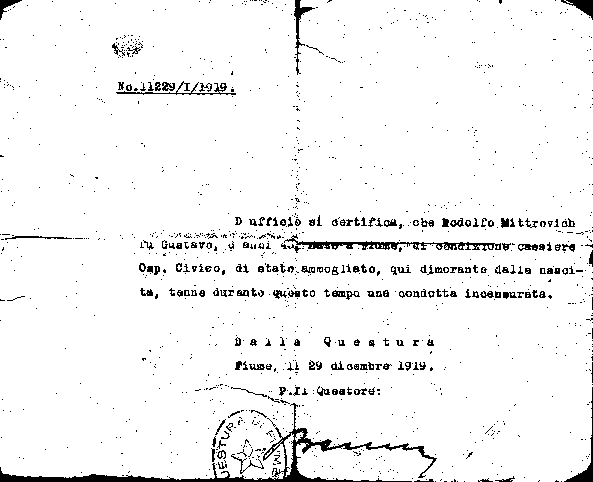 A sinistra della firma, un timbro a inchiostro, "Magistrato civico Fiume".