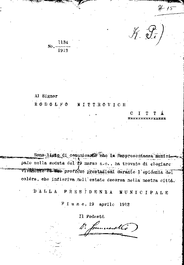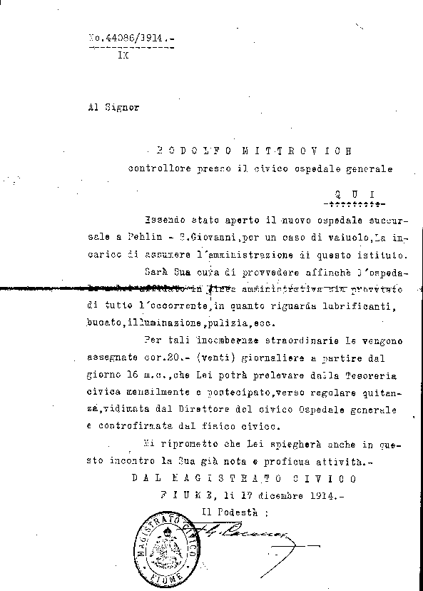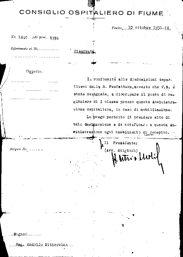 A sinistra della firma, un timbro a inchiostro "Cicico Ospedale Generale Fiume".