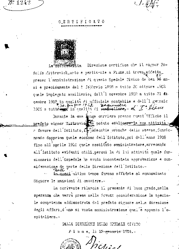 Certificato n. 1242 del 23 gennaio 1914 della Direzione