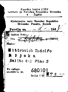 IX 1948. Si vede l'ultimo indirizzo, a Salita del Pino 2. Cedola dell'amministrazione Croata del tempo,